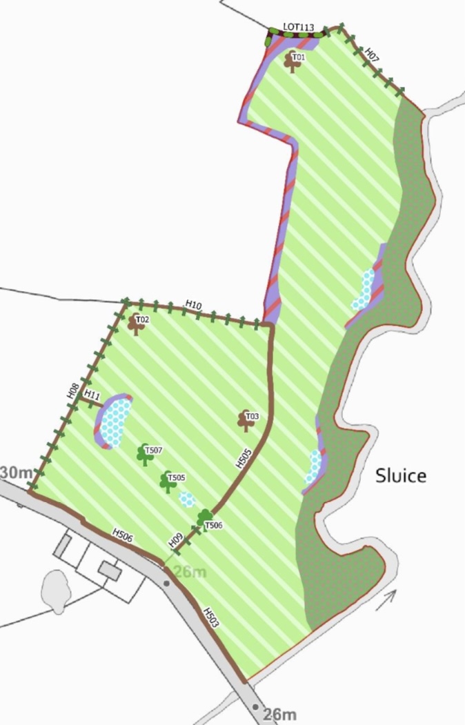 Another change is that the woodland is now targeted to be “mixed broadleaf woodland” rather than “wet woodland”. Although the strip of woodland we are creating is along the boundary of the stream and in the floodplain, we are not confident that it will flood regularly enough to achieve wet woodland status. Through what has been a very wet winter, it has not flooded. We will certainly plant tree species that thrive in wetter conditions, and if it turns out that it does flood regularly we can adapt our plan. But mindful that we are entering into a legal contract to achieve the target habitat, it feels safer to start out under promising, with the hope that we can over deliver in future.
