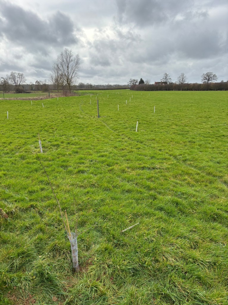 The woodland has only got 120 scattered trees planted for the moment. Over the area that will become woodland this looks quite sparse, but this will change. Partly those trees will grow of course, but also our ecologist advisers expect there to be natural regeneration. A further reason is that we still need to add about 30 older trees (not that old, but 8-10 years old). To generate the woodland biodiversity units we need to have a mix of ages of trees to meet the requirements, which makes it worth the expense of bringing in more mature trees. However, if we are not going to be able to either generate biodiversity units or find a market for them, then we might as well be more patient and plant young trees spread over the next decade.